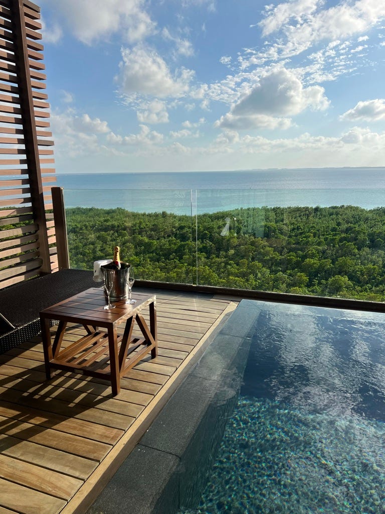 There are three different kinds of accommodations at NIZUC — Ocean Suites, Residence Suites, Private Villas — and I stayed in an Ocean View Junior Suite. The decor is wrapped in modern minimalism with floor-to-ceiling glass sliding doors that open out to a private plunge pool, perfect for watching an uninterrupted sunset melt into the Caribbean Sea. Plus, the pool warms up with the day thanks to the strong sun, making an evening dip under the stars just as alluring.